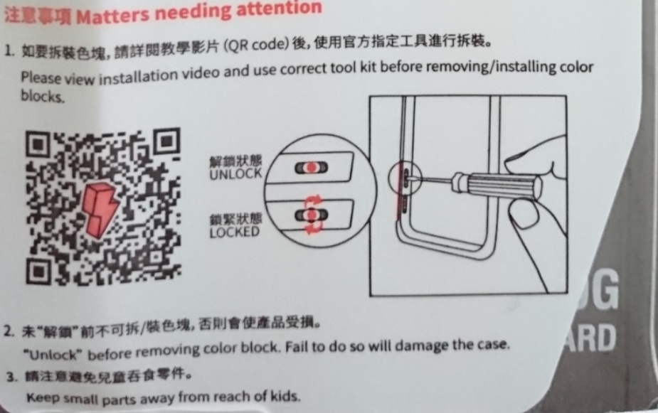 手機殼上的色塊是可以拆裝的,有使用教學,需使用官方指定工具進行喔,以免邊框受損