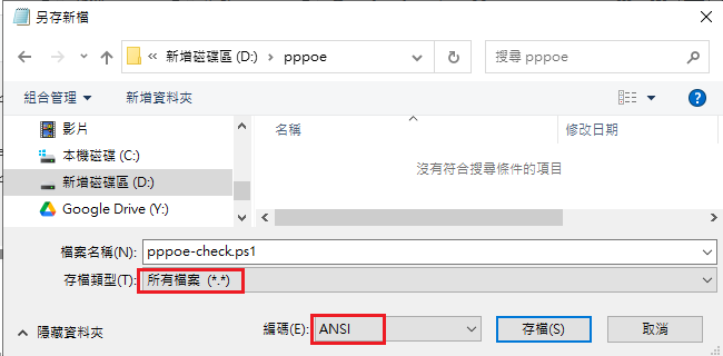 (2)、「run-pppoe.bat」跟「pppoe-check.ps1」這兩個檔案,建議使用windows內建的文字編輯器產生,存檔時並使用「ANSI」編碼,避免執行時因為亂碼而無法順利執行指令。
